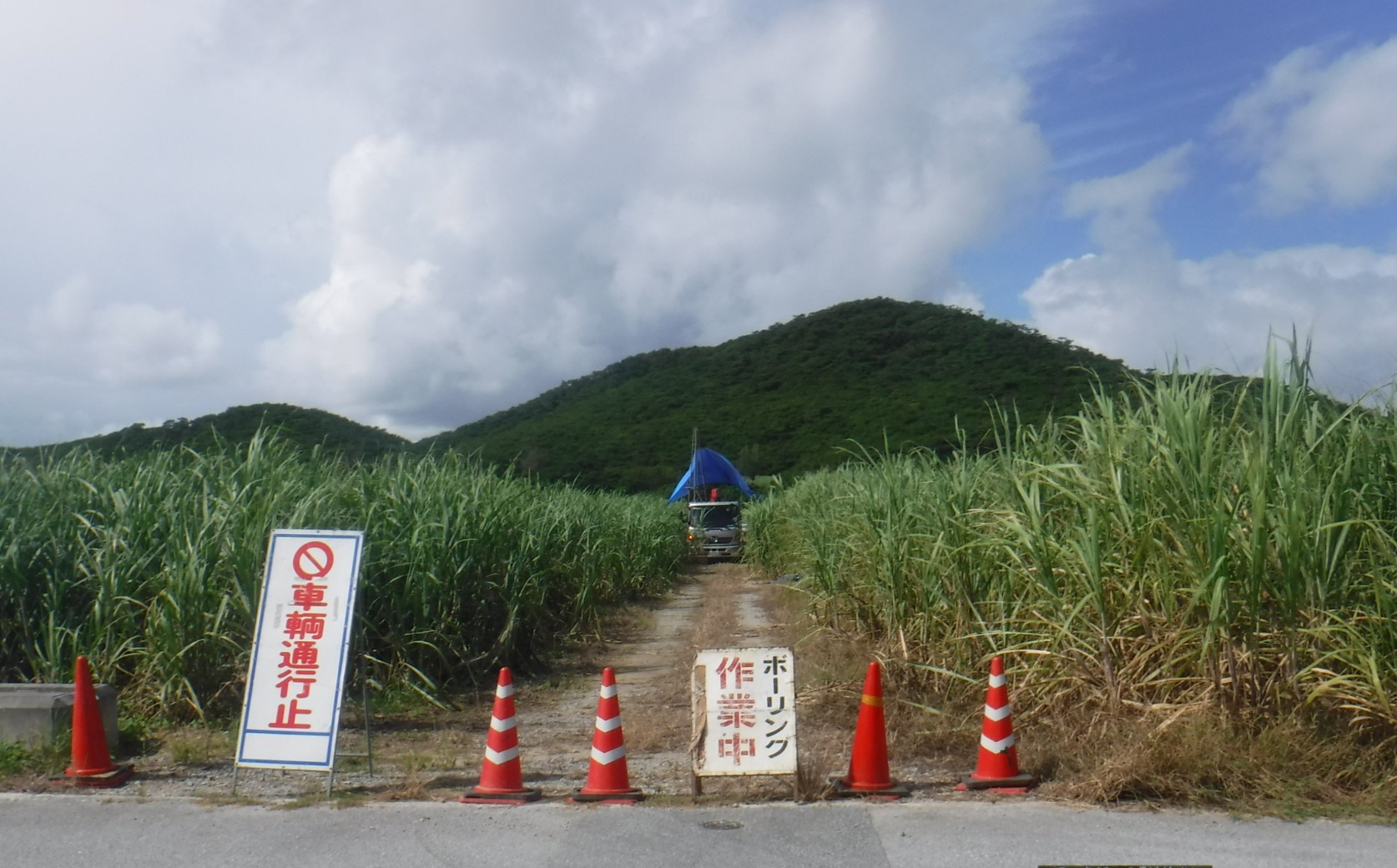 現場はサトウキビ畑に囲まれた農道